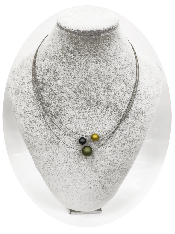 3 reihige feine Halskette, aus kunststoff ummantelten Edelstahldraht, 3 eloxierten Aluminium Perlen