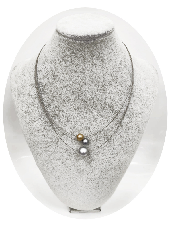 OLA5011- 3 reihige feine Halskette, 3 Perlen aus elox. Alu, Farbe:silber,grau,gold