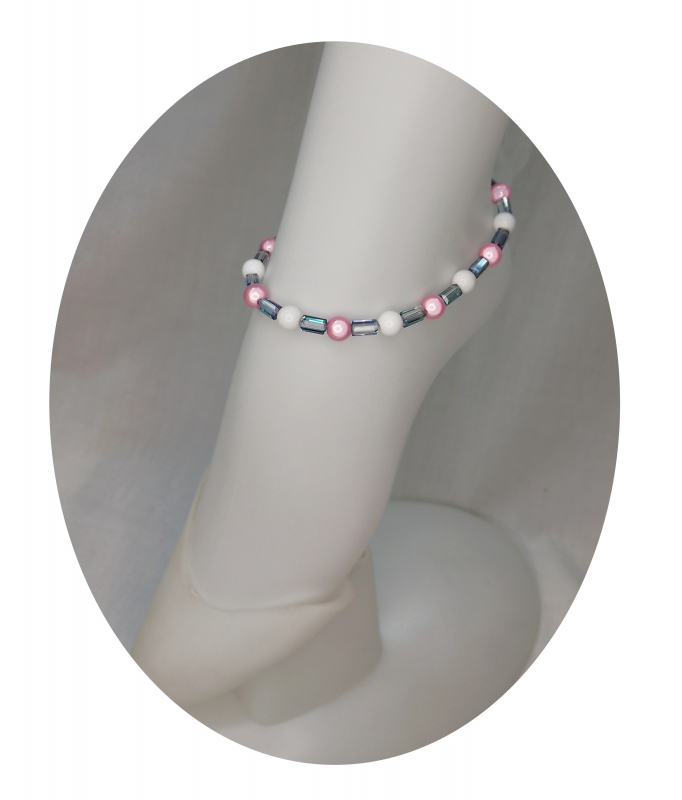 FMP2002- Fusskette aus Magic Perlen, Rosa+Weiss 8mm + kristall