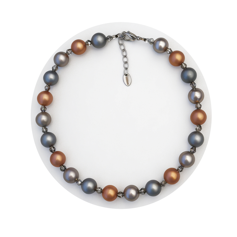 Hauptteile sind Kugel aus eloxiertem Aluminium Bunte,  Edelstahlverschluss mit Verlängerungsketten.