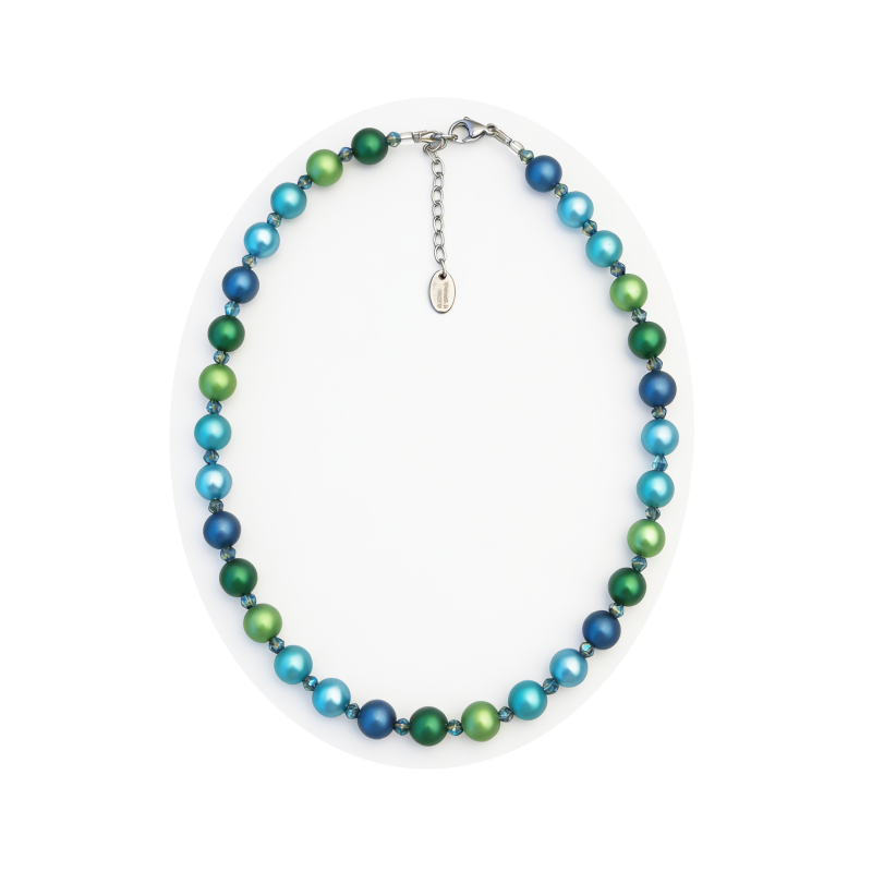 Hauptteile sind Kugel aus eloxiertem Aluminium Bunte,  Edelstahlverschluss mit Verlängerungsketten.