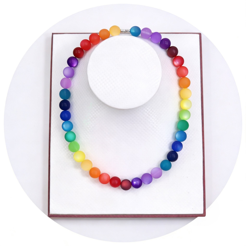 Ein prachtvolles Stück Regenbogenverlauf viele elegande mattierte Farben. Länge : ca 46 cm. Material: Kunstharzperlen, Verschluß Magnet Form: Halskette, Kugel
