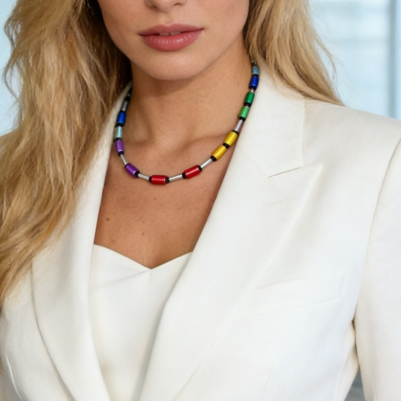 Dieses Kollier besteht aus 6x10 mm großen Walzen. Material: aus farbenfrohen eloxiertem Aluminium, dazwischen sind Kristalldoppelkegel bzw Alustäbchen.