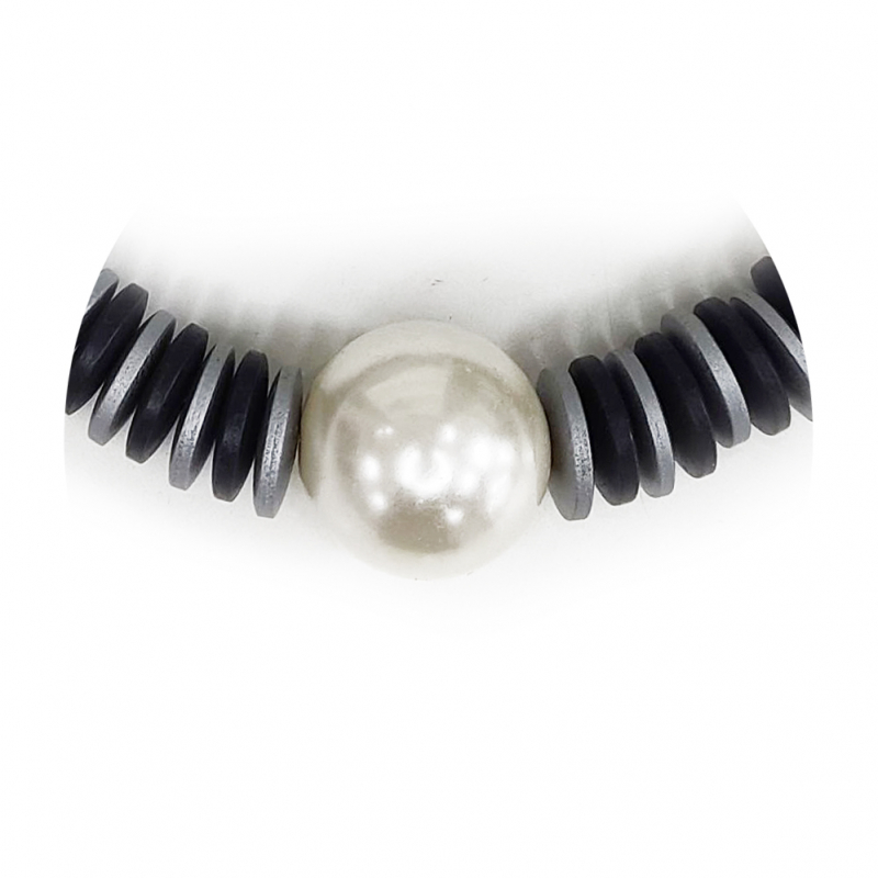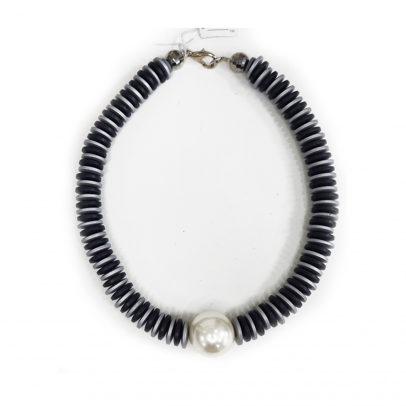CLMA004- Kette aus Holzscheiben im schwarz, grau mit weißen Kugel