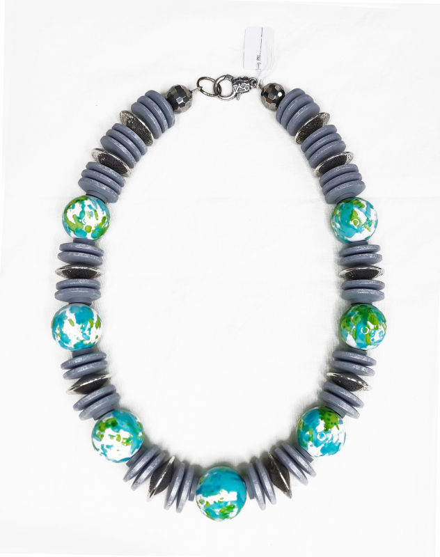 RIC2001- Kette aus Holzscheiben grau, Galaxy Kugel 20mm