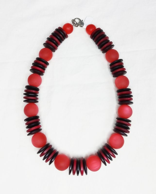 RIC1001- Kette aus Holzscheiben Rot Schwarz, Kunstharz Kugel Rot 20mm