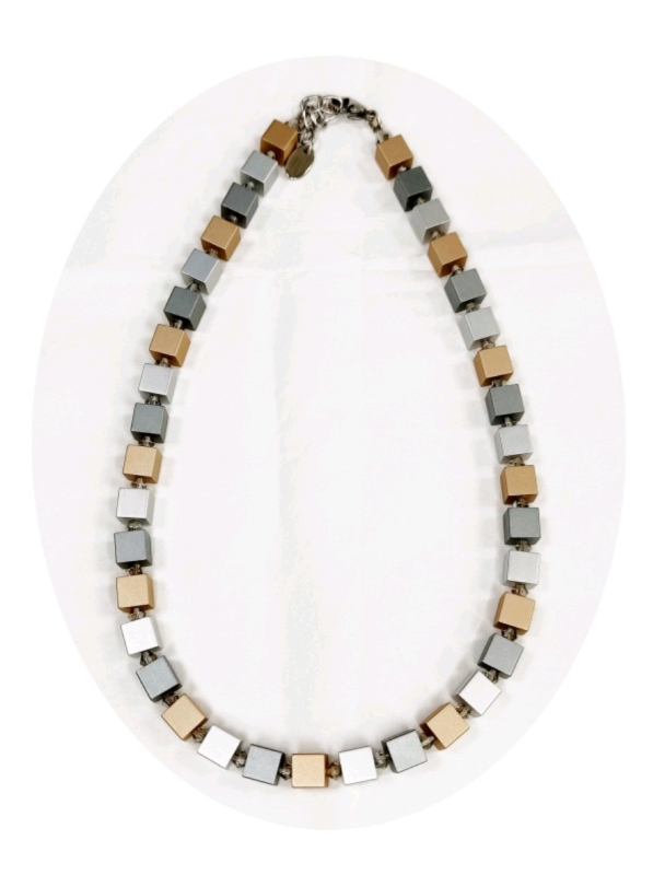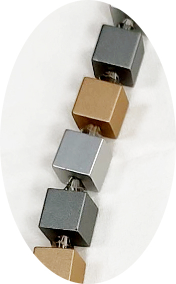 Hauptteile sind Würfel aus eloxiertem Aluminium Bunte, Edelstahlverschluss mit Verlängerungsketten.