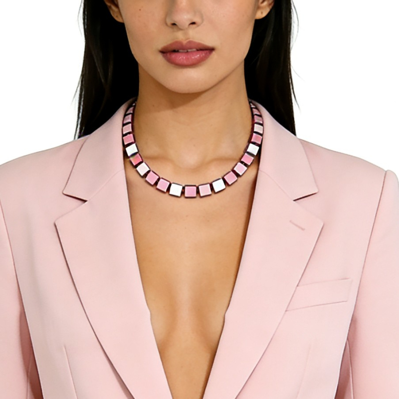 Hauptteile sind Würfel aus eloxiertem Aluminium Bunte, Edelstahlverschluss mit Verlängerungsketten.